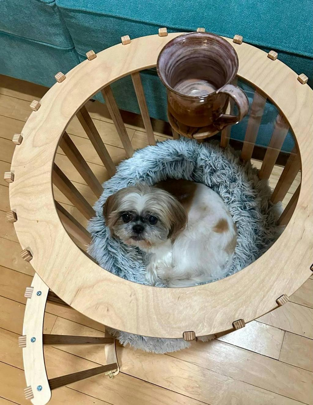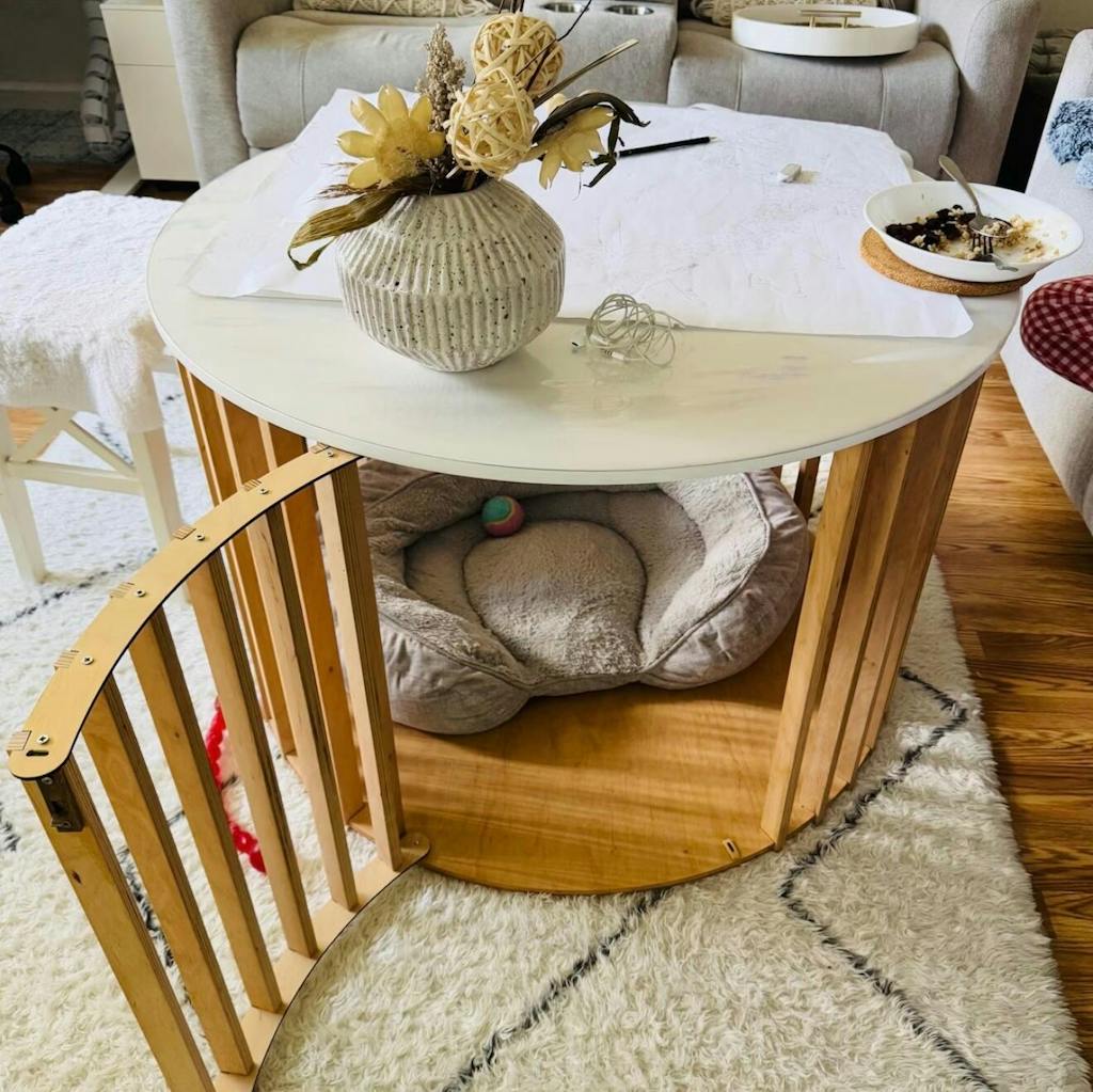 Light Wooden Dog House Coffee Table with Glass Top – Indoor Dog Cage Furniture.
